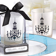 A regal chandelier silhouette stands out against softly frosted glass on these elegant votive favors. Treat your guests to a little romance-to-go with a candleholder they can keep and relight at home again and again